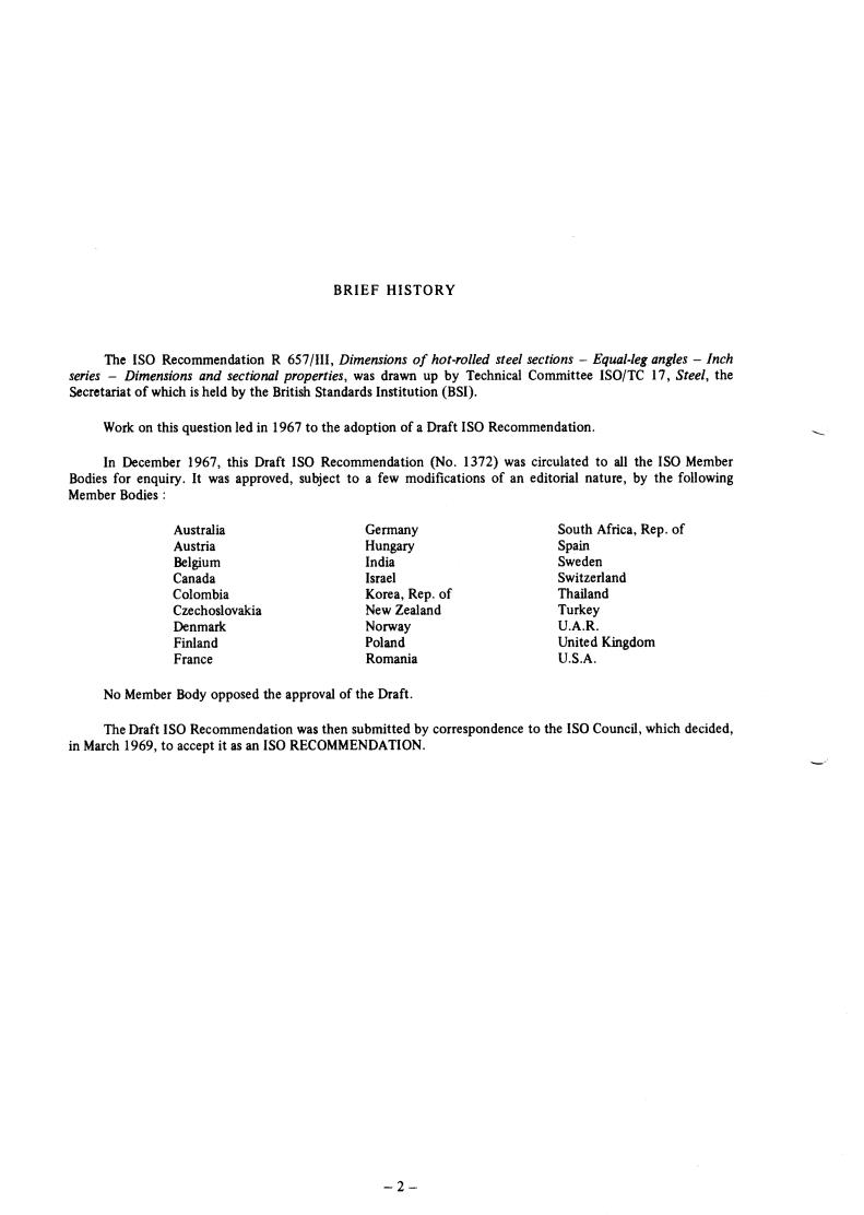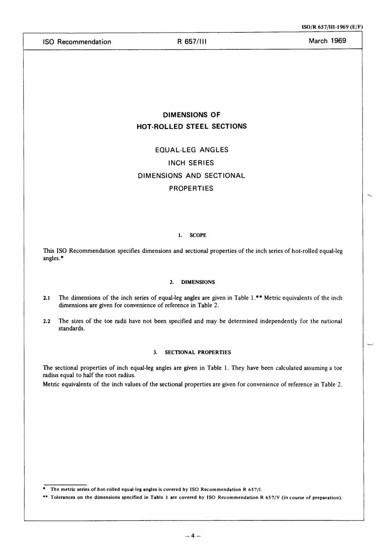 The IS0 Recommendation R 657/III, Dimensions of hot-rolled steel sections - Equal-leg angles - Inch