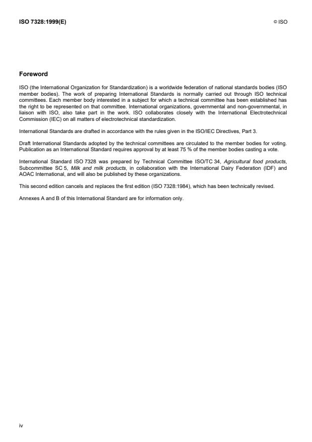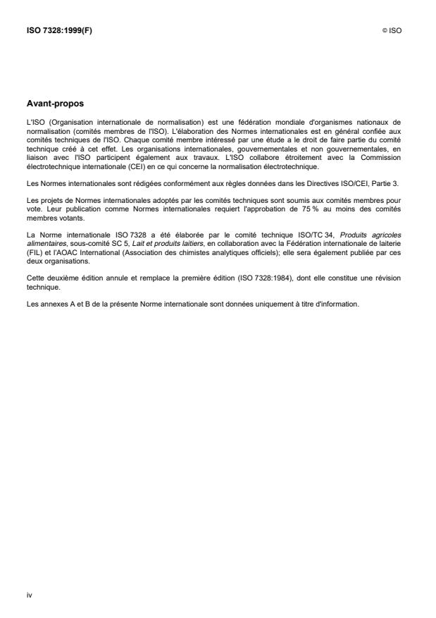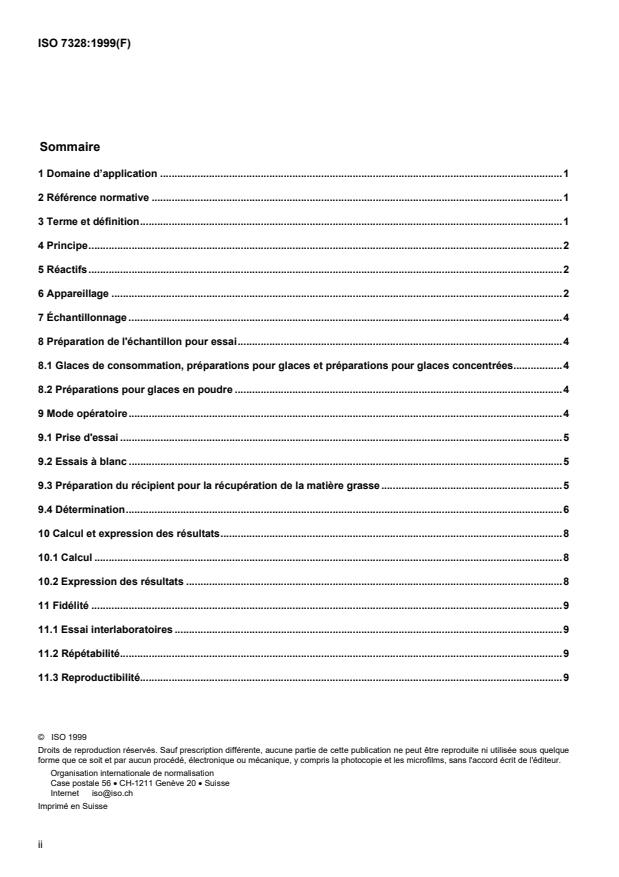 ISO 7328:1999 is a standard published by the International Organization for Standardization (ISO). Its full title is "Milk-based edible ices and ice mixes — Determination of fat content — Gravimetric method (Reference method)". This standard covers: La présente Norme internationale spécifie la méthode de référence pour la détermination de la teneur en matière grasse dans la plupart des glaces de consommation et préparations pour glaces à base de lait.La présente méthode est également applicable aux préparations pour glaces concentrées et en poudre.La présente méthode n'est pas applicable à certaines glaces de consommation et préparations pour glaces à base de lait, dont le taux d'agents émulsifiant, stabilisant, épaississant ou de jaune d'oeuf ou de fruits, ou des combinaisons de ces constituants, rend la méthode Röse-Gottlieb inutilisable. Pour de tels produits, il convient d'avoir recours à une méthode utilisant le principe de Weibull-Berntrop (voir l'ISO 8262-2).
