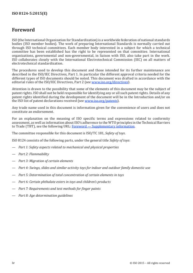 ISO 8124-5:2015 is a standard published by the International Organization for Standardization (ISO). Its full title is "Safety of toys - Part 5: Determination of total concentration of certain elements in toys". This standard covers: ISO 8124-5:2015 specifies methods of sampling and digestion prior to analysis of the total concentration of the elements antimony, arsenic, barium, cadmium, chromium, lead, mercury, and selenium from toy materials and from parts of toys. Digestion methods for the elements mentioned above are specified for the following types of toy materials: coatings of paints, varnishes, lacquers, printing inks, polymers, and similar coatings; polymeric and similar materials, including laminates, whether textile-reinforced or not, but excluding other textiles; paper, paperboard, and cardboard; natural or synthetic textiles; metallic materials whether coated or not; other materials, whether mass-coloured or not (e.g. wood, fibreboard, hardboard, bone, and leather); materials intended to leave a trace (e.g. the graphite materials in pencils and liquid ink in pens); pliable modelling materials, including modelling clays and gels; paints to be used as such in the toy, including finger paints, varnishes, lacquers, and similar materials in solid or liquid form; packaging materials that form part of the toy or have intended play value.