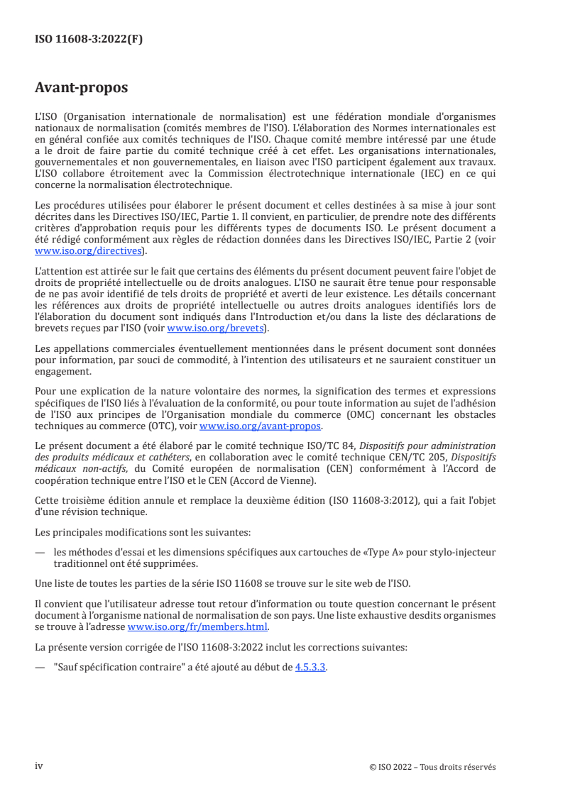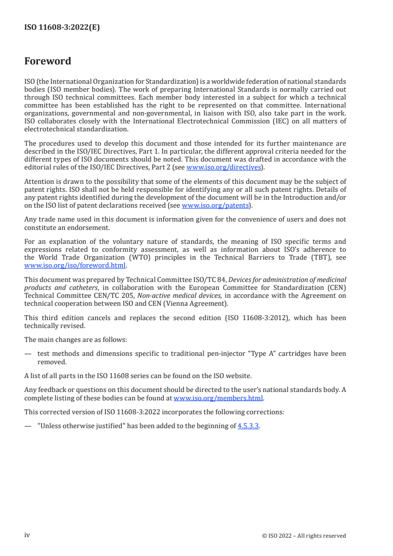 ISO 11608-3:2022 is a standard published by the International Organization for Standardization (ISO). Its full title is "Needle-based injection systems for medical use — Requirements and test methods — Part 3: Containers and integrated fluid paths". This standard covers: This document specifies requirements and test methods for design verification of containers and integrated fluid paths used with Needle-Based Injection Systems (NISs) according to ISO 11608-1. It is applicable to single and multi-dose containers either filled by the manufacturer (primary container closure) or by the end-user (reservoir) (e.g. cartridges, syringes) and fluid paths that are integrated with the NIS at the point of manufacture. This document is also applicable to prefilled syringes (see ISO 11040-8) when used with a NIS (see also scope of ISO 11608-1:2022). This document is not applicable to the following products: — sterile hypodermic needles; — sterile hypodermic syringes; — sterile single-use syringes, with or without needle, for insulin; — containers that can be refilled multiple times; — containers intended for dental use; — catheters or infusion sets that are attached or assembled separately by the user.
