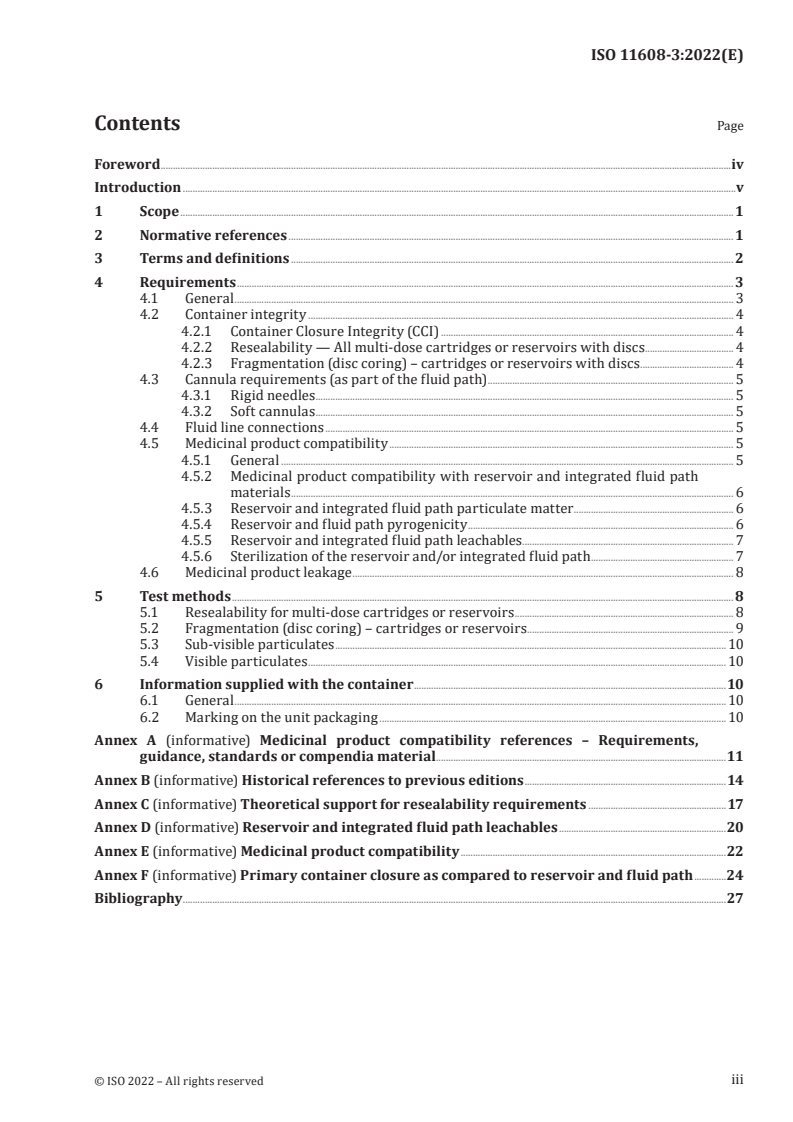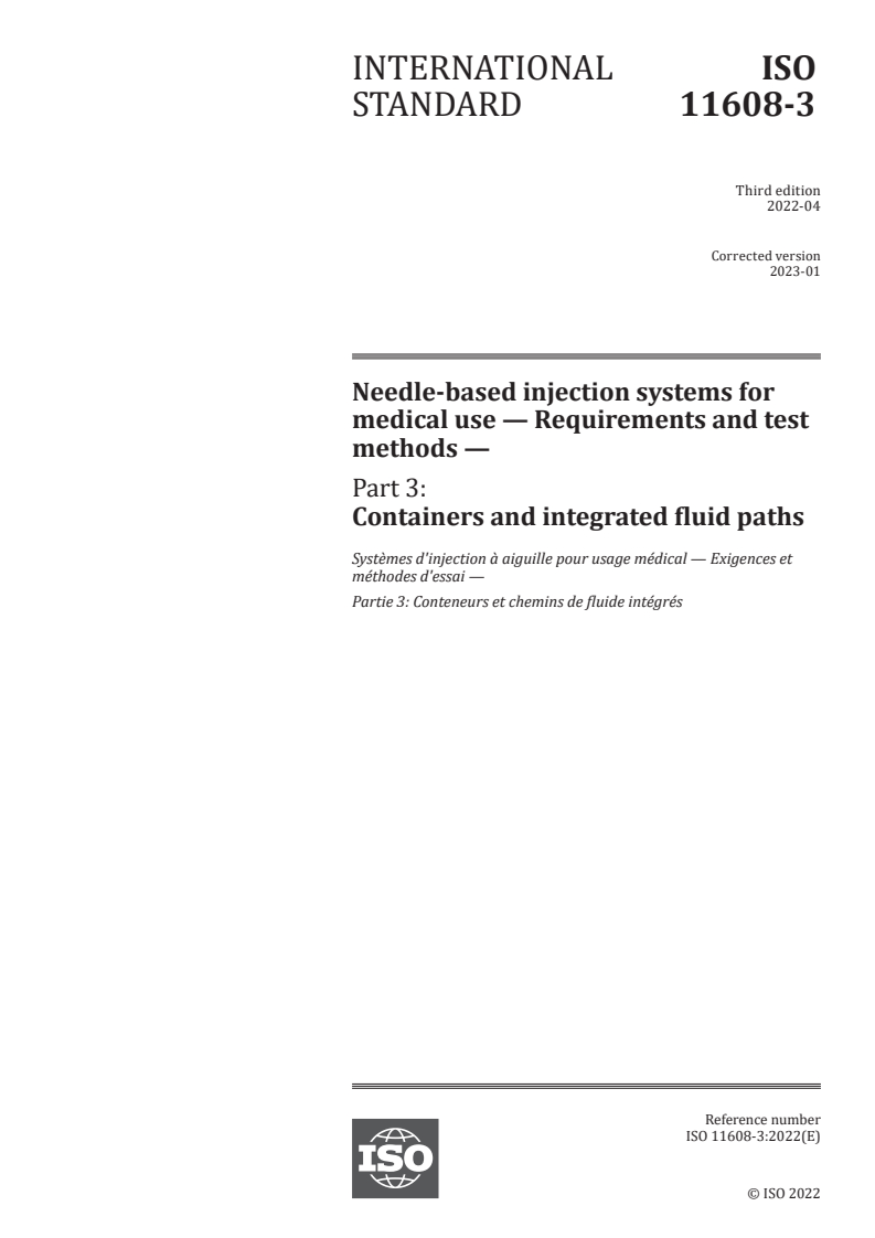 ISO 11608-3:2022 - Needle-based injection systems for medical use — Requirements and test methods — Part 3: Containers and integrated fluid paths Released:4/7/2022
