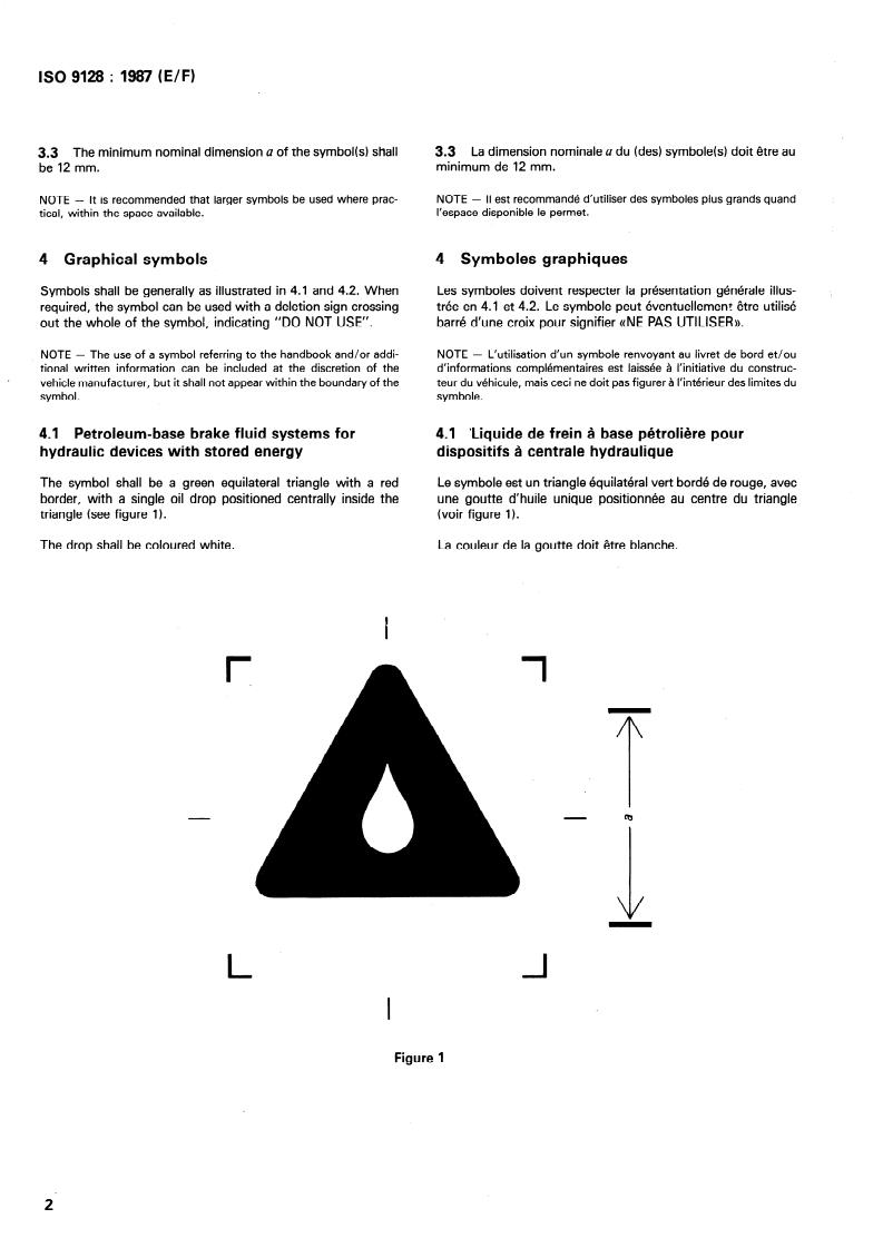 ISO 9128:1987 is a standard published by the International Organization for Standardization (ISO). Its full title is "Road vehicles — Graphical symbols to designate brake fluid types". This standard covers: Specifies the graphical symbols and colours used to identify, on road vehicles, the correct type of fluid to be used for: petroleum-base brake fluid systems; non-petroleum-base brake fluid systems. The same symbols are also used for labelling the fluid containers (ISO 3871). Non-petroleum-base fluids (ISO 4925, glycol type) and petroleum-base fluids (ISO 7308) are totally incompatible, requiring the use of different seal materials.