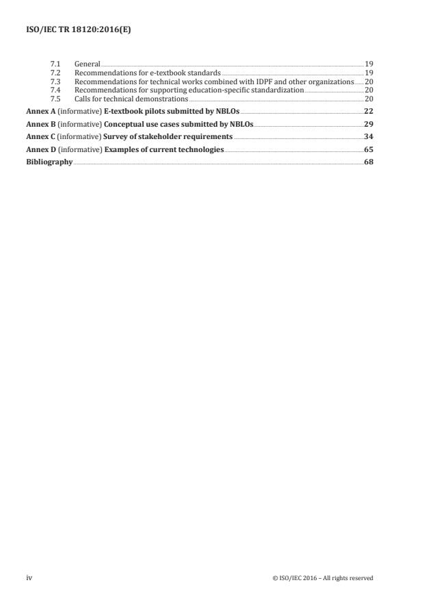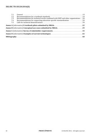 ISO/IEC TR 18120:2016 is a technical report published by the International Organization for Standardization (ISO). Its full title is "Information technology - Learning, education, and training - Requirements for e-textbooks in education". This standard covers: ISO/IEC TR 18120:2016 makes recommendations that are intended to build consensus on which International Standards for e-textbooks can be developed. It is a follow up to the collection of inputs from interested parties and aims to - review the current state of the e-textbook market, - summarize LET requirements for e-textbooks based on use cases and survey of interested parties, - review existing data standards that are referenced by potential e-textbook standards, - describe key terms and concepts that underpin any further discussion on e-textbook standards, - propose a set of functionalities that will be required for e-textbook reader software, - make recommendations for any modification to existing data standards, and - make recommendations for any new data standards that might be needed.