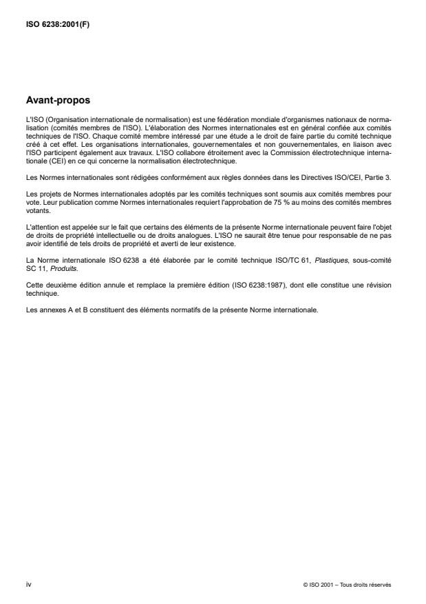 La Norme internationale ISO 6238 a été élaborée par le comité technique ISO/TC 61, Plastiques, sous-comité