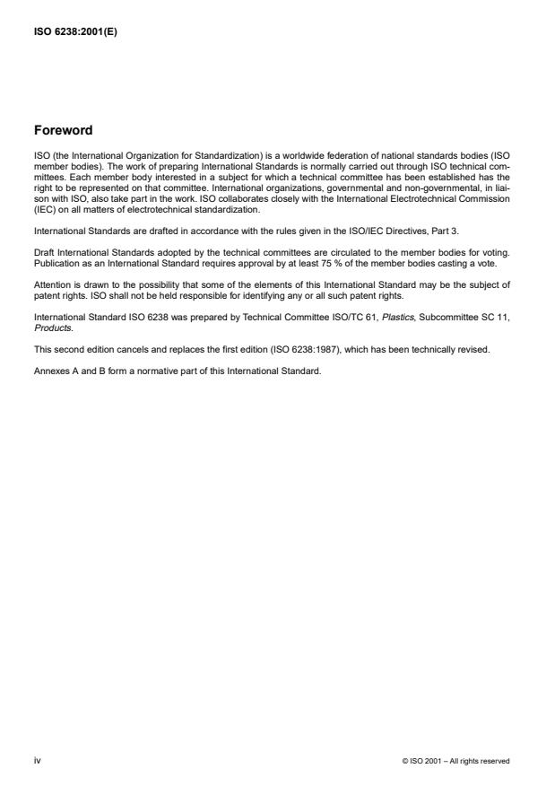 International Standard ISO 6238 was prepared by Technical Committee ISO/TC 61, Plastics, Subcommittee SC 11,