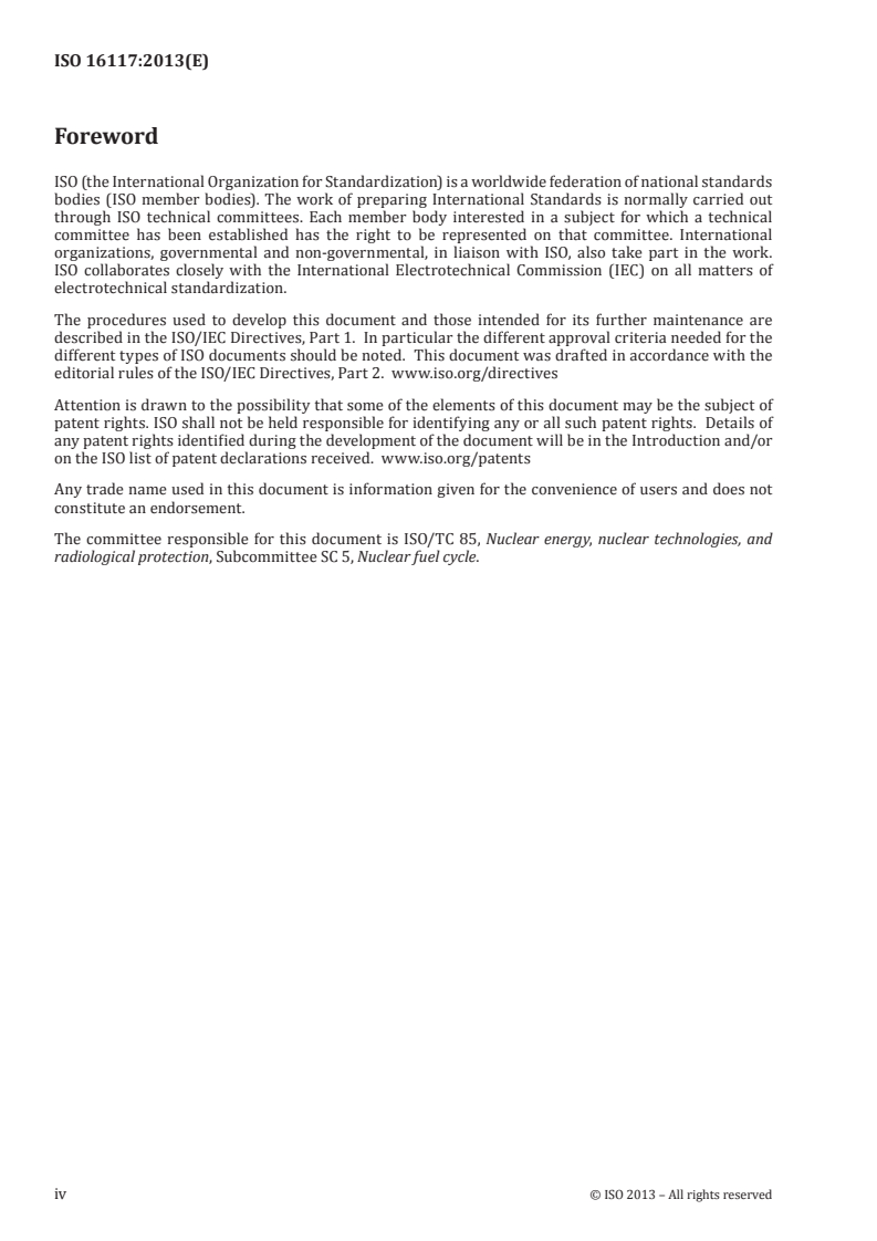 ISO 16117:2013 provides a methodology to estimate a reasonably maximal value of the number of fissions of a postulated criticality accident. The fission number estimate, associated with its postulated criticality accident, impacts the accident emergency planning and response because it is used for the estimation of radiation doses and of radioactive materials release. ISO 16117:2013 does apply to nuclear facilities, plants, laboratories, storage, and transportation of fissile material (but not to nuclear power reactor cores) where a credible criticality accident may occur.
