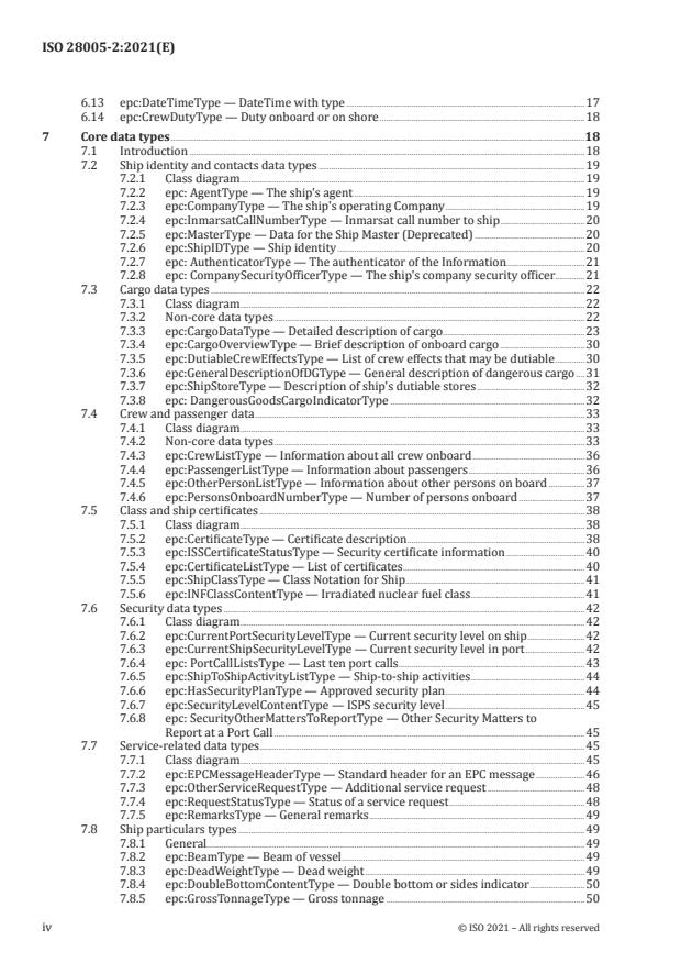 ISO 28005-2:2021 is a standard published by the International Organization for Standardization (ISO). Its full title is "Ships and marine technology — Electronic port clearance (EPC) — Part 2: Core data elements". This standard covers: This document provides technical specifications to facilitate an efficient exchange of electronic information between ships and shore, for coastal transit or port calls. It specifies requirements for the safety, security and efficiency enhancement of information, related mainly to the relationships between the ship and the port and coastal state authorities. This document provides the definition of core data elements for use in electronic port clearance (EPC) messages. It does not define any structuring of messages nor provides any guidance on what information is required for a particular purpose; it is a general data dictionary for safety, security or operation-related maritime information. Details about message formats and applications are defined in ISO 28005-1. The data elements in this document is a superset of the data elements and the data model defined in the IMO Reference Data Model as specified in the IMO Compendium on Facilitation and Electronic Business. It also contains data elements from other IMO instruments as described in 4.1. The specifications in this document is compatible with the definitions in the IMO Reference Data Model and the mapping between ISO 28005 and the data element list in the IMO Reference Data Model is defined in Annex B.