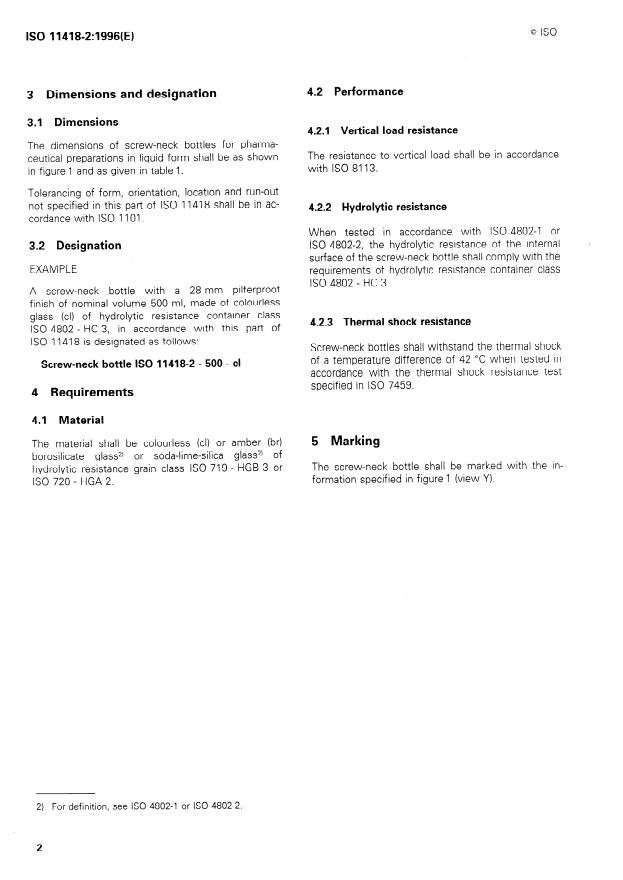 ISO 11418-2:1996 is a standard published by the International Organization for Standardization (ISO). Its full title is "Containers and accessories for pharmaceutical preparations — Part 2: Screw-neck bottles for syrups". This standard covers: Specifies the design, dimensions, materials and requirements of screw-neck bottles used for pharmaceutical preparations in liquid form (sirups). Together with the corresponding closure systems, they serve for packaging of pharmaceutical preparations which are not intended for parenteral use.