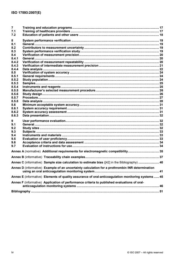 ISO 17593:2007 specifies requirements for in vitro measuring systems for self-monitoring of vitamin-K antagonist therapy, including performance, quality assurance and user training and procedures for the verification and validation of performance by the intended users under actual and simulated conditions of use. ISO 17593:2007 pertains solely to prothrombin time measuring systems used by individuals for monitoring their own vitamin-K antagonist therapy, and which report results as international normalized ratios (INR). ISO 17593:2007 is applicable to manufacturers of such systems and those other organizations (e.g., regulatory authorities and conformity assessment bodies) having the responsibility for assessing the performance of these systems. ISO 17593:2007 does not pertain to in vitro measuring systems for coagulation quantities assessing vitamin-K antagonist therapy used by physicians or healthcare providers, provide a comprehensive evaluation of all possible factors that could affect the performance of these systems, or address the medical aspects of oral anticoagulation therapy.