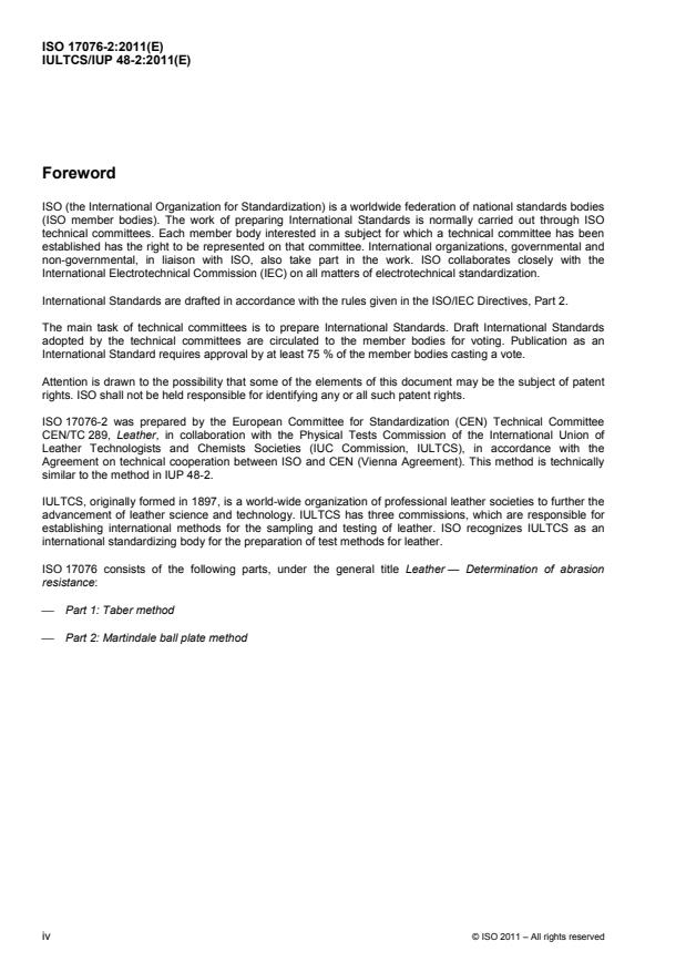 ISO 17076-2:2011 specifies a method of determining the abrasion resistance of upholstery leather for different applications using Martindale apparatus with a ball plate. The method is applicable to semi-aniline, pigmented and coated leather.