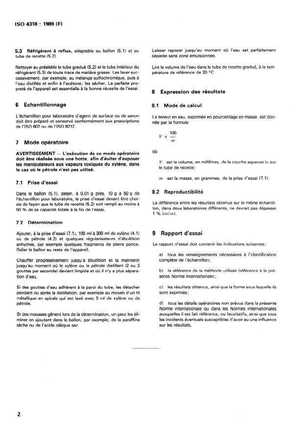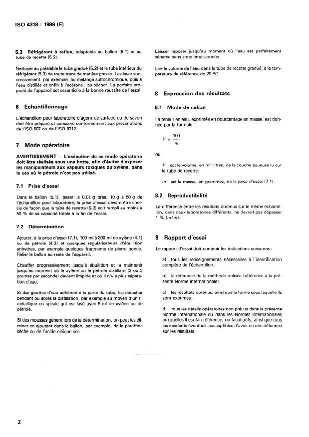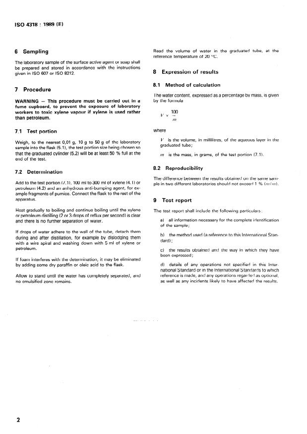 ISO 4318:1989 specifies an azeotropic distillation (Dean–Stark) method for determining the water content of surface active agents and soaps. The procedure removes water from a test portion by azeotropic distillation with boiling xylene or petroleum and measures the collected aqueous phase volume. The method is intended for powders with water content greater than 5 % (m/m), and for products in paste or solution form. It is not applicable to samples containing water-soluble volatile compounds (for example, ethanol).