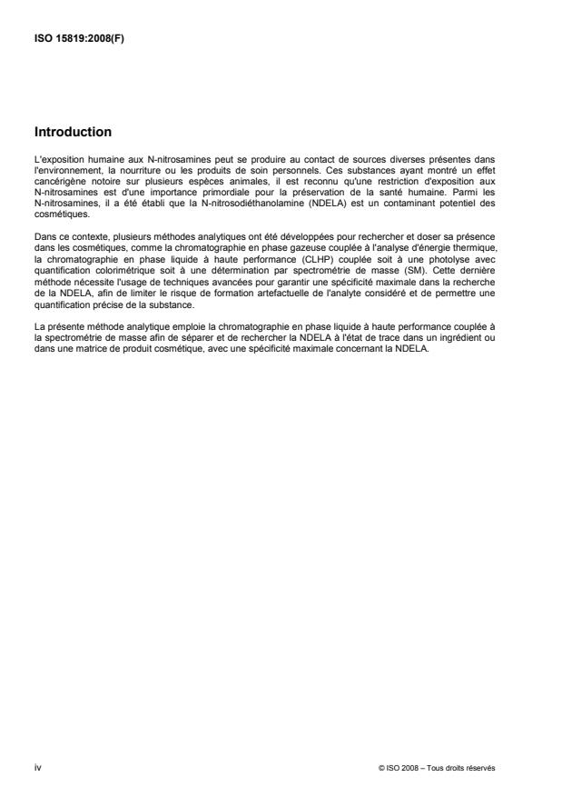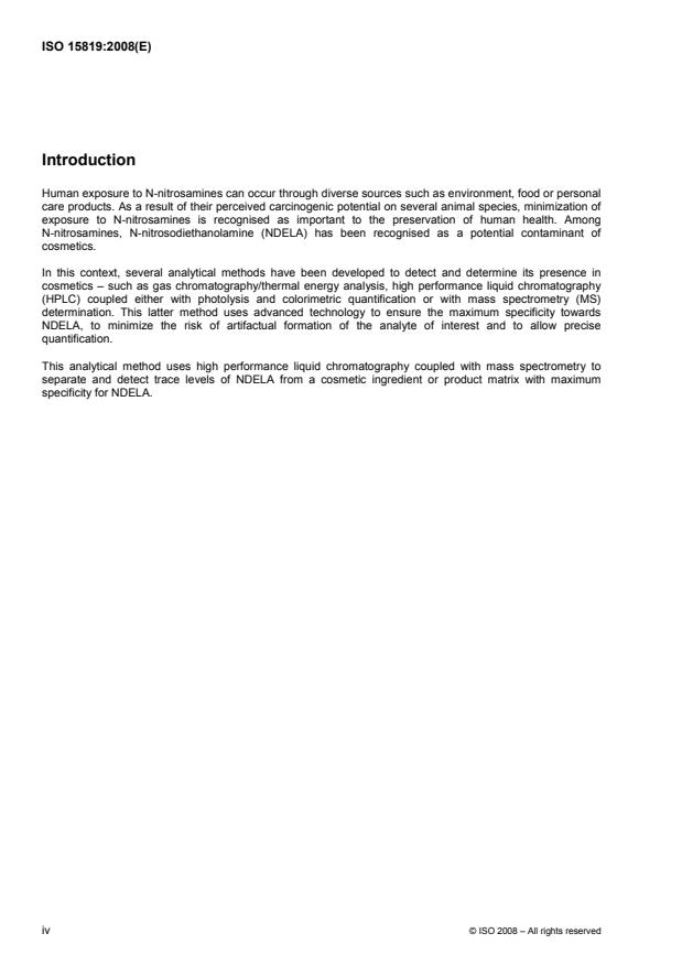 ISO 15819:2008 describes a method for the detection and quantification of NDELA in cosmetics and raw materials used in cosmetics. This method is not applicable to the detection and/or quantification of nitrosamines other than NDELA nor to the detection and/or quantification of NDELA in products other than cosmetics or raw materials used in cosmetics.
