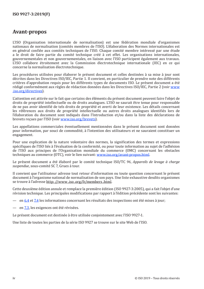ISO 9927-3:2019 is a standard published by the International Organization for Standardization (ISO). Its full title is "Cranes - Inspections - Part 3: Tower cranes". This standard covers: This document specifies the regular inspections to be carried out on tower cranes. It does not cover inspection prior to the first use of a tower crane.
