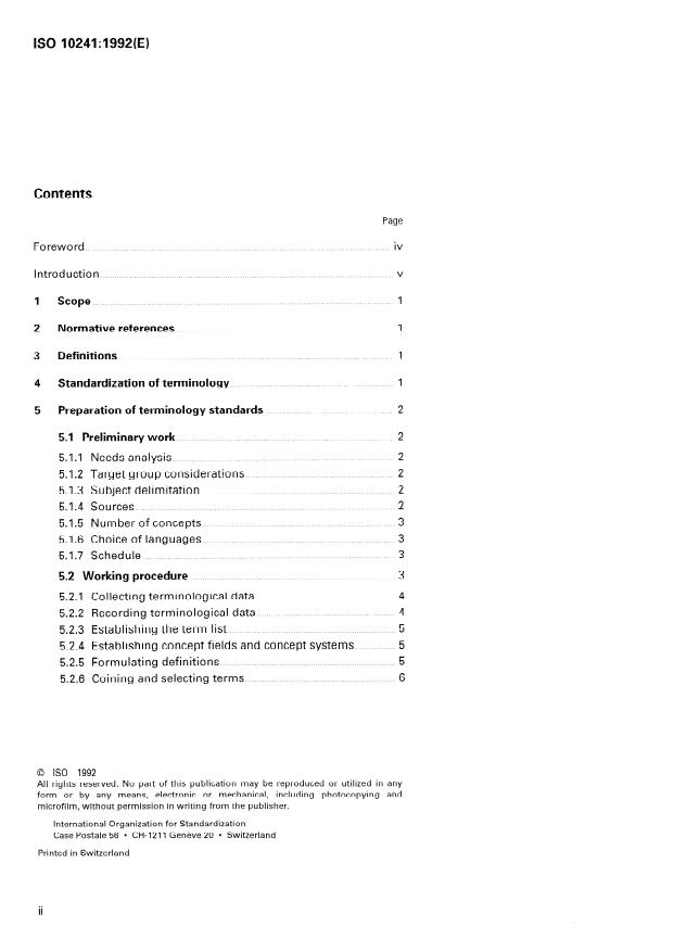 Establishes rules for the preparation: preliminary work (needs analysis, target group, subject delimitation, sources, number of concepts, choice of languages, schedule) and working procedure (collecting and recording terminological data, establishing the term list, concept fields and concept systems, formulating definitions, coining and selecting terms), as well as for the terminography (structuring of entries, order of entries, indexes, graphic representation, bibliography). Does not deal with changes that may be necessary when an International Standard is adopted as a national standard.