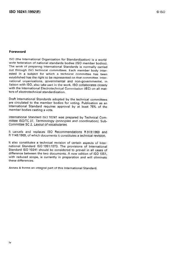 ISO 10241:1992 is a standard published by the International Organization for Standardization (ISO). Its full title is "International terminology standards — Preparation and layout". This standard covers: Establishes rules for the preparation: preliminary work (needs analysis, target group, subject delimitation, sources, number of concepts, choice of languages, schedule) and working procedure (collecting and recording terminological data, establishing the term list, concept fields and concept systems, formulating definitions, coining and selecting terms), as well as for the terminography (structuring of entries, order of entries, indexes, graphic representation, bibliography). Does not deal with changes that may be necessary when an International Standard is adopted as a national standard.
