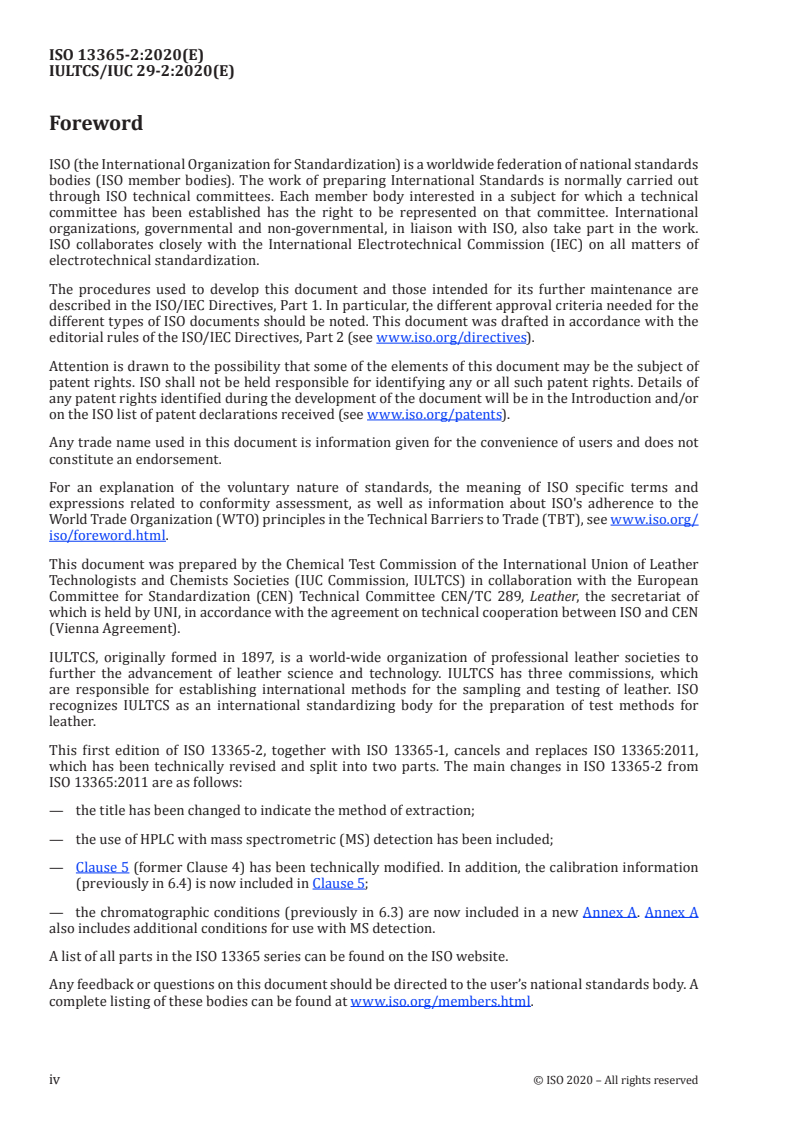 ISO 13365-2:2020 - Leather — Chemical determination of the preservative (TCMTB, PCMC, OPP, OIT) content in leather by liquid chromatography — Part 2: Artificial perspiration extraction method Released:8/3/2020