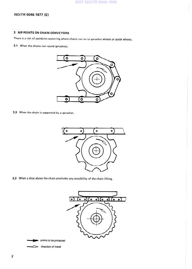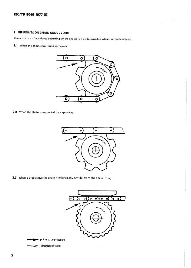 ISO/TR 5046:1977 is a technical report published by the International Organization for Standardization (ISO). Its full title is "Continuous mechanical handling equipment — Safety code for conveyors and elevators with chain-elements — Examples for guarding of nip points". This standard covers: The aim is to give examples for the guarding of nip points between the chains and the sprocket wheels or caterpillar drives for all conveyors and elevators using chains as transporting elements. Describes different safety devices. Supplements the various International Standards dealing with safety of continuous mechanical handling equipment.