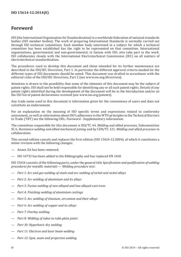 ISO 15614-12:2014 specifies the tests which can be used for qualification of welding procedure specifications for spot, seam, and projection welding processes. It is part of the ISO 15614 series, details of which are given in ISO 15607, Annex A. ISO 15614-12:2014 defines the conditions for carrying out tests and the limits of validity of a qualified welding procedure for all practical welding operations covered by it.