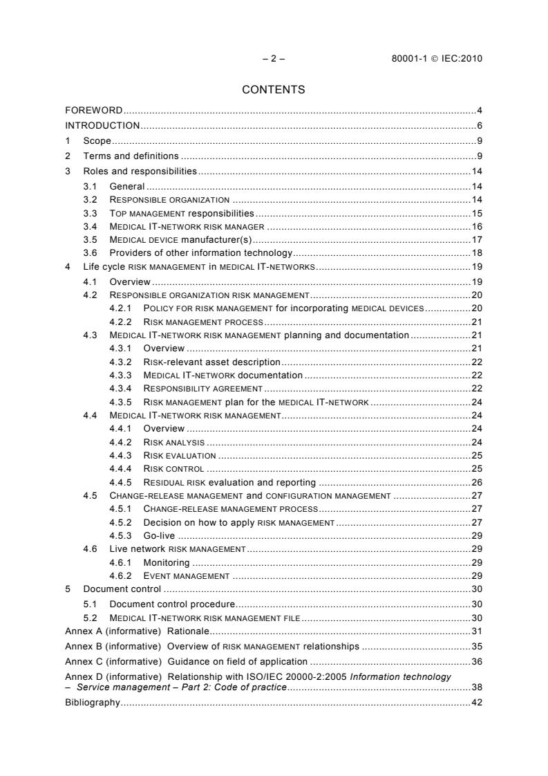 IEC 80001-1:2010 is a standard published by the International Organization for Standardization (ISO). Its full title is "Application of risk management for IT-networks incorporating medical devices — Part 1: Roles, responsibilities and activities". This standard covers: ig ig 2 4 1995-11-10T12:27:00Z 2010-10-28T06:28:00Z 2010-10-28T06:28:00Z 1 184 1053 IEC 8 2 1235 10.6858 BestFit Clean 21 0 0 MicrosoftInternetExplorer4 /* Style Definitions */ table.MsoNormalTable {mso-style-name:"Table Normal"; mso-tstyle-rowband-size:0; mso-tstyle-colband-size:0; mso-style-noshow:yes; mso-style-parent:""; mso-padding-alt:0cm 5.4pt 0cm 5.4pt; mso-para-margin:0cm; mso-para-margin-bottom:.0001pt; mso-pagination:widow-orphan; font-size:10.0pt; font-family:"Times New Roman";} IEC 80001-1:2010 Recognizing that medical devices are incorporated into IT-networks to achieve desirable benefits (for example, interoperability), defines the roles, responsibilities and activities that are necessary for risk management of IT-networks incorporating medical devices to address safety, effectiveness and data and system security (the key properties). IEC 80001-1:2010 does not specify acceptable risk levels. IEC 80001-1:2010 applies after a medical device has been acquired by a responsible organization and is a candidate for incorporation into an IT-network. It applies throughout the life cycle of IT-networks incorporating medical devices. IEC 80001-1:2010 applies where there is no single medical device manufacturer assuming responsibility for addressing the key properties of the IT-network incorporating a medical device. IEC 80001-1:2010 applies to responsible organizations, medical device manufacturers and providers of other information technology for the purpose of risk management of an IT-network incorporating medical devices as specified by the responsible organization. It does not apply to personal use applications where the patient, operator and responsible organization are one and the same person.