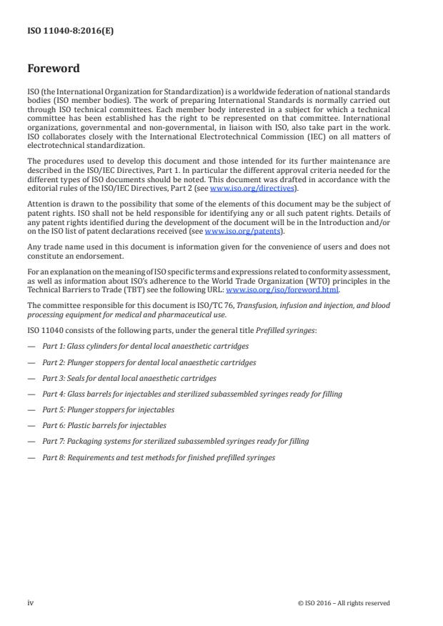 ISO 11040-8:2016 is a standard published by the International Organization for Standardization (ISO). Its full title is "Prefilled syringes - Part 8: Requirements and test methods for finished prefilled syringes". This standard covers: ISO 11040-8:2016 is applicable to aseptically filled or terminally sterilized finished prefilled syringes (intended for single use only) based on ISO 11040‑4 or ISO 11040‑6, together with ISO 11040‑5, for parenteral injection preparations with focus on quality, functional performance and safety requirements, as well as relevant test methods. Finished prefilled syringes which have undergone an additional preparation step by the user before injection (e.g. diluent syringes that have been emptied for reconstitution and in which the reconstituted drug solution has been aspirated after reconstitution) are excluded from the scope of ISO 11040-8:2016.