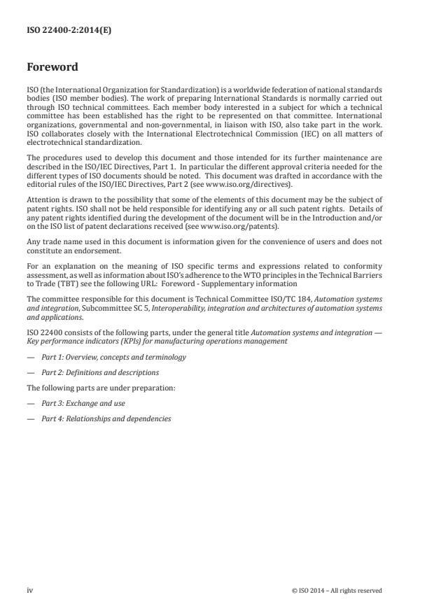ISO 22400-2:2014 is a standard published by the International Organization for Standardization (ISO). Its full title is "Automation systems and integration - Key performance indicators (KPIs) for manufacturing operations management - Part 2: Definitions and descriptions". This standard covers: ISO 22400 defines key performance indicators (KPIs) used in manufacturing operations management. ISO 22400-2:2014 specifies a selected number of KPIs in current practice. The KPIs are presented by means of their formula and corresponding elements, their time behaviour, their unit/dimension and other characteristics. ISO 22400-2:2014 also indicates the user group where the KPIs are used, and the production methodology to which they correspond. With reference to equipment, the KPIs in ISO 22400-2:2014 relate to work units, as specified in IEC 62264.