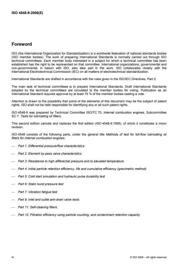 ISO 4548-9:2008 is a standard published by the International Organization for Standardization (ISO). Its full title is "Methods of test for full-flow lubricating oil filters for internal combustion engines - Part 9: Inlet and outlet anti-drain valve tests". This standard covers: ISO 4548-9:2007 specifies methods of measuring the effectiveness of either inlet or outlet anti-drain valves if fitted to a full-flow lubricating oil filter of the "spin-on" or "easy change" type, for internal combustion engines.