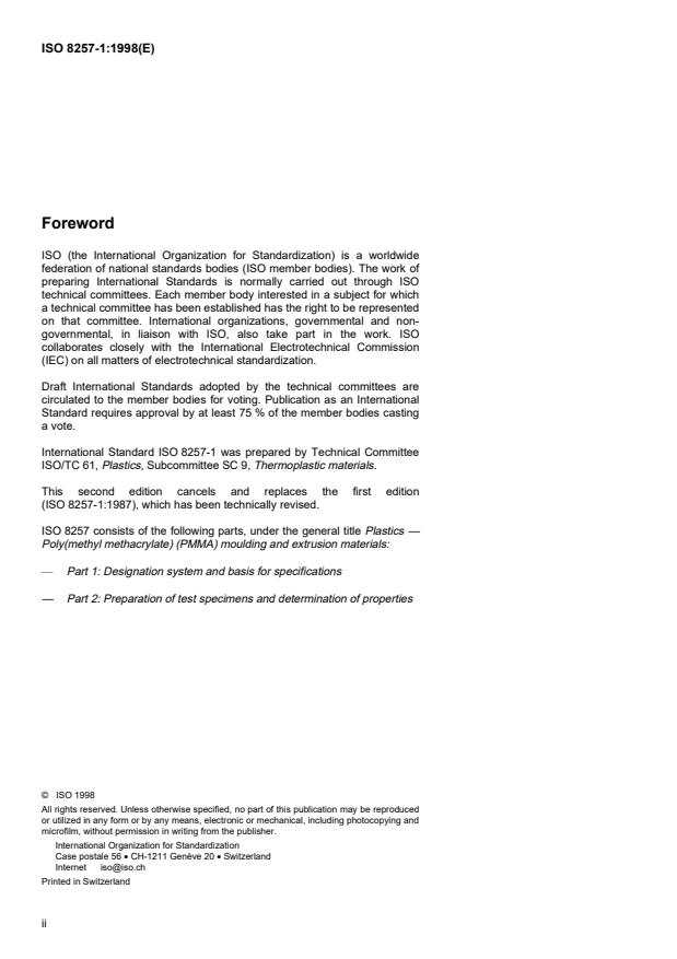 ISO 8257-1:1998 - Plastics -- Poly(methyl methacrylate) (PMMA) moulding and extrusion materials