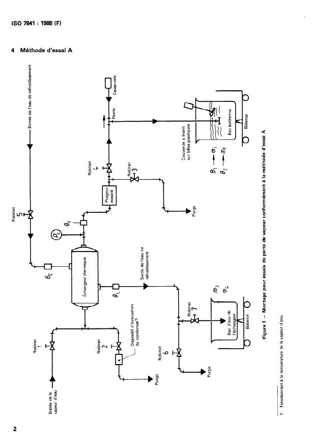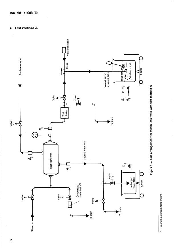 ISO 7841:1988 is a standard published by the International Organization for Standardization (ISO). Its full title is "Automatic steam traps — Determination of steam loss — Test methods". This standard covers: Specifies two test methods for steam traps. The object of these tests is to determine the amount of live steam, if any, that is lost through the steam trap. There is no measurement of the total heat energy lost by the trap. Such total heat loss would include radiation and convection components which can be established separately. Figure 1 shows the test arrangement for test method A, and figure 2 shows the test arrangement for test method B.