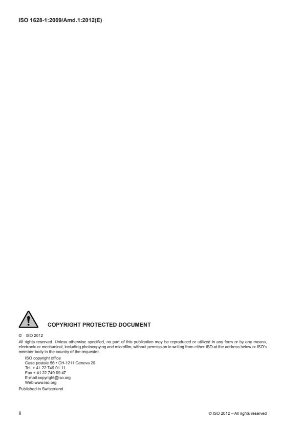 ISO 1628-1:2009/Amd 1:2012 is available in PDF format for immediate download after purchase. The document can be added to your cart and obtained through the secure checkout process. Digital delivery ensures instant access to the complete standard document.