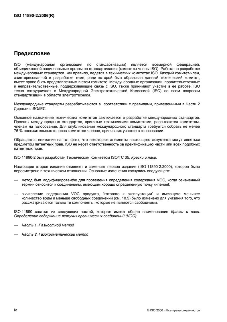 ISO 11890-2:2006 is one of a series of standards dealing with the sampling and testing of paints, varnishes and related products. It specifies a method for the determination of the volatile organic compound (VOC) content of paints, varnishes and their raw materials. ISO 11890-2 is preferred if the expected VOC content is greater than 0,1 % by mass and less than about 15 % by mass. When the VOC content is greater than about 15 % by mass, the less complicated method given in ISO 11890-1 may be used. This method assumes that the volatile matter is either water or organic. However, other volatile inorganic compounds can be present and might need to be quantified by another suitable method and allowed for in the calculations.