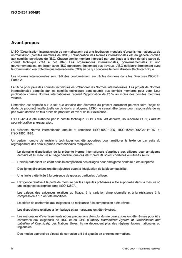 L'ISO 24234:2004 spécifie les exigences et les méthodes d'essai applicables aux alliages et au mercure utilisés dans la préparation des amalgames dentaires, les exigences et les méthodes d'essai de l'amalgame lui-même et les exigences d'emballage et de marquage correspondantes. Elle est applicable aux alliages livrés sous forme de poudre en vrac, de poudre compressée en tablettes ou de poudre en capsules prédosées. Elle est applicable au mercure à usage dentaire livré en vrac, en sachets prédosés ou en capsules prédosées. L'ISO 24234:2004 n'exclut pas la fourniture d'alliage ou de mercure séparément. L'ISO 24234:2004 n'est pas applicable aux alliages destinés à l'usage avec des métaux liquides autres que le mercure ni aux alliages métalliques liquides.