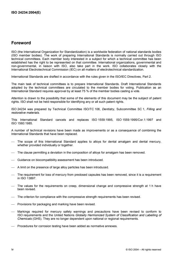 ISO 24234:2004 specifies the requirements and test methods for alloys and for mercury suitable for the preparation of dental amalgam, together with the requirements and test methods for that amalgam and the requirements for packaging and marking. It is applicable to alloys supplied in the form of either a powder in bulk, or a powder compressed to form a tablet, or a powder in predosed capsules. It is applicable to dental mercury supplied either in bulk quantities, or in predosed sachets, or in predosed capsules. ISO 24234:2004 does not exclude the supply of alloy or mercury separately. ISO 24234:2004 is not applicable to alloys intended for use with liquid metals that are not mercury, nor is it applicable to liquid metal alloys.