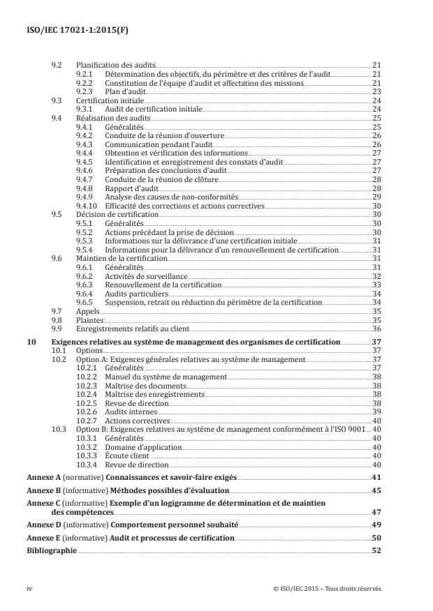 L'ISO/IEC 17021-1:2015 spécifie les principes et les exigences relatifs à la compétence, à la cohérence et à l'impartialité des organismes procédant à l'audit et à la certification de tous les types de systèmes de management. Les organismes de certification conformes à l'ISO/IEC 17021-1:2015 ne sont pas tenus de proposer tous les types de certification de système de management. La certification de systèmes de management est une activité d'évaluation de la conformité par tierce partie et les organismes exerçant cette activité sont par conséquent des organismes d'évaluation de la conformité par tierce partie.