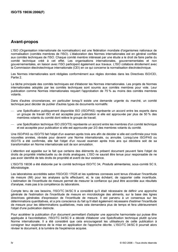 L'ISO/TS 19036:2006 donne des lignes directrices pour l'estimation et l'expression de l'incertitude de mesure (IM) liée aux résultats des analyses quantitatives en microbiologie des aliments. Elle est applicable à l'analyse quantitative des produits destinés à la consommation humaine et à l'alimentation des animaux, et d'échantillons environnementaux dans le domaine de la production et de la manutention de produits alimentaires, normalement effectuée par dénombrement de micro-organismes selon une technique de comptage des colonies, mais également à l'analyse quantitative selon des méthodes alternatives, instrumentales. L'ISO/TS 19036:2006 n'est pas applicable au dénombrement utilisant une technique de Nombre le Plus Probable, ou à l'analyse de faibles niveaux de micro-organismes.