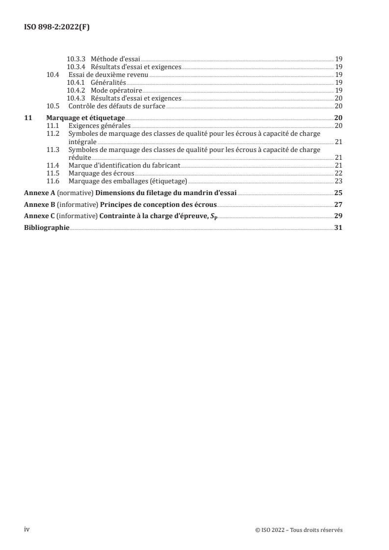 Le présent document spécifie les caractéristiques mécaniques et physiques des écrous en acier non allié ou acier allié, lorsqu’ils sont soumis à essai dans la plage de température ambiante de 10 °C à 35 °C. Le présent document s’applique aux écrous: — à filetage métrique ISO (voir l'ISO 68‑1), — de combinaisons diamètre/pas selon l'ISO 261 et l'ISO 262, — de diamètres de filetage M5 à M39 pour le pas gros, et M8×1 à M39×3 pour le pas fin, — de tolérances de filetage selon l’ISO 965‑1, l’ISO 965‑2 ou l’ISO 965‑5, — de classes de qualité spécifiées 04, 05, 5, 6, 8, 10 et 12, incluant la charge d’épreuve, — de trois styles d’écrou différents (voir 5.1): écrous normaux (style 1), écrous hauts (style 2) et écrous bas (style 0), — de diamètre extérieur minimal ou de surplat minimal s ≥ 1,45D, — conçus pour être utilisés avec des vis, goujons et tiges filetées de classes de qualité conformes à l'ISO 898‑1 (voir l’Annexe B), et — destinés à être utilisés pour des applications dans la plage de –50 °C à +150 °C, ou jusqu’à +300 °C. AVERTISSEMENT — Les écrous conformes aux exigences du présent document sont soumis à essai dans la plage de température ambiante de 10 °C à 35 °C et sont utilisés pour des applications dans la plage de –50 °C à +150 °C; cependant, ces écrous sont également utilisés en dehors de cette plage et jusqu’à +300 °C pour des applications spécifiques. Il est possible qu'ils ne conservent pas les caractéristiques mécaniques et physiques spécifiées à des températures plus basses et/ou plus élevées. Par conséquent, il est de la responsabilité de l’utilisateur de déterminer les choix appropriés en fonction des conditions d’environnement de l’assemblage pour une application donnée (voir également 7.1). Pour les spécifications supplémentaires applicables aux écrous galvanisés à chaud, voir l’ISO 10684. Pour les écrous conçus pour des applications particulières, voir l’ISO/TR 16224. Le présent document ne spécifie pas d’exigence pour des caractéristiques fonctionnelles telles que: — les caractéristiques d'autofreinage (voir l’ISO 2320), — les caractéristiques de couple/tension (voir l’ISO 16047 pour la méthode d'essai), — la soudabilité, ou — la résistance à la corrosion.