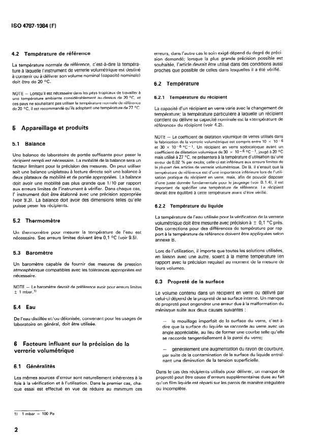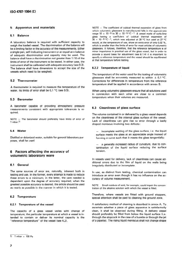 ISO 4787:1984 is a standard published by the International Organization for Standardization (ISO). Its full title is "Laboratory glassware — Volumetric glassware — Methods for use and testing of capacity". This standard covers: The general procedure is based upon a determination of volume of water in the vessel. The described procedures are applicable to ware with capacities in the range of 0,1 to 2000 ml. These include transfer and one-mark pipettes without subdivision, graduated measuring pipettes and dilution pipettes, burettes and volumetric flasks. The apparatus, materials, accuracy, setting of the meniscus, delivery time and test procedure and handling of the different types of vessels are specified.