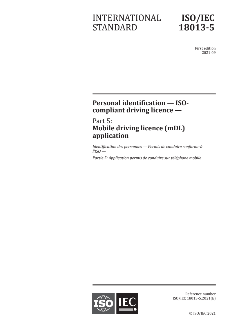ISO/IEC 18013-5:2021 - Personal identification — ISO-compliant driving licence — Part 5: Mobile driving licence (mDL) application Released:9/30/2021