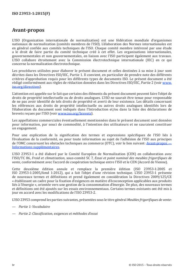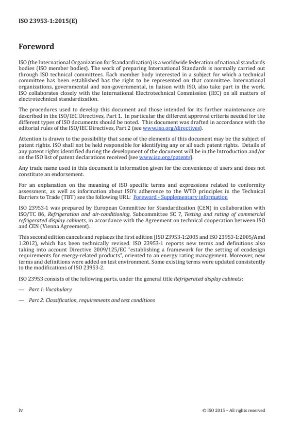 ISO 23953-1:2015 establishes a vocabulary of terms and definitions relative to refrigerated display cabinets used for the sale and display of foodstuffs. It is not applicable to refrigerated vending machines or cabinets intended for use in catering or similar non-retail applications. NOTE In addition to terms in English and French, two of the three official ISO languages, this part of ISO 23953 gives the equivalent terms in German, Italian, and Spanish; these are published under the responsibility of the member bodies for Germany (DIN), Italy (UNI), and Spain (AENOR). However, only the terms and definitions given in the official languages can be considered as ISO terms and definitions.