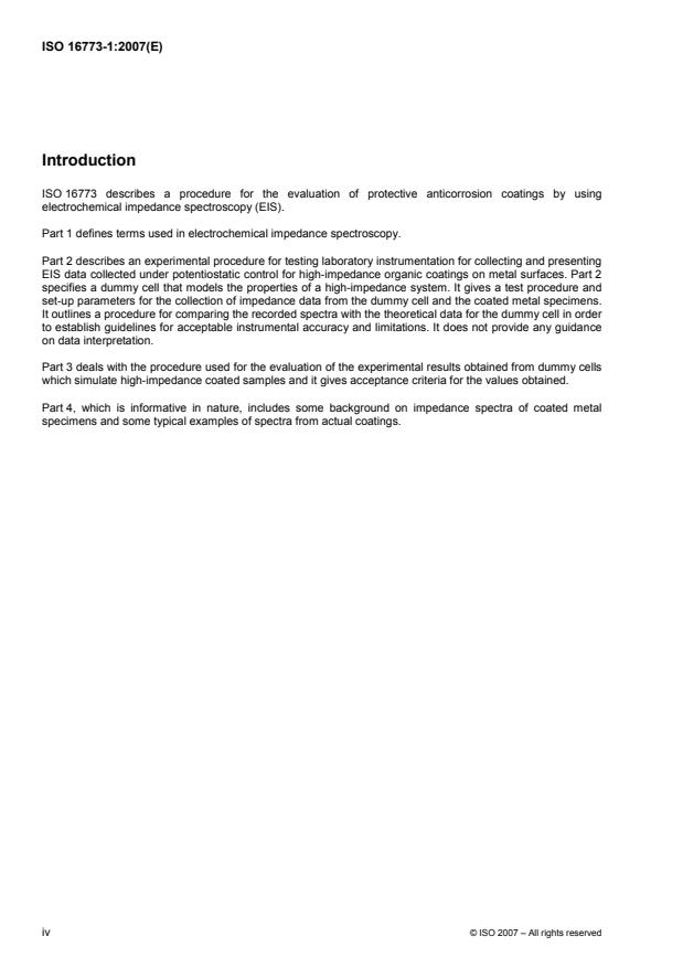 ISO 16773-1:2007 is a standard published by the International Organization for Standardization (ISO). Its full title is "Paints and varnishes — Electrochemical impedance spectroscopy (EIS) on high-impedance coated specimens — Part 1: Terms and definitions". This standard covers: ISO 16773-1:2007 gives terms and definitions for electrochemical impedance spectroscopy (EIS) for use in the other parts of ISO 16773.