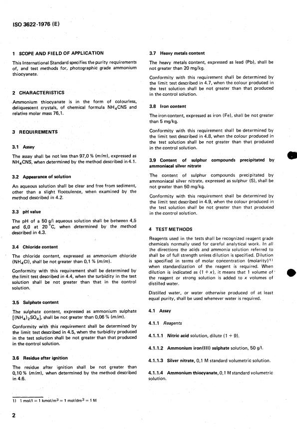ISO 3622:1976 is a standard published by the International Organization for Standardization (ISO). Its full title is "Photographic grade ammonium thiocyanate — Specification". This standard covers: Photographic grade ammonium thiocyanate — Specification