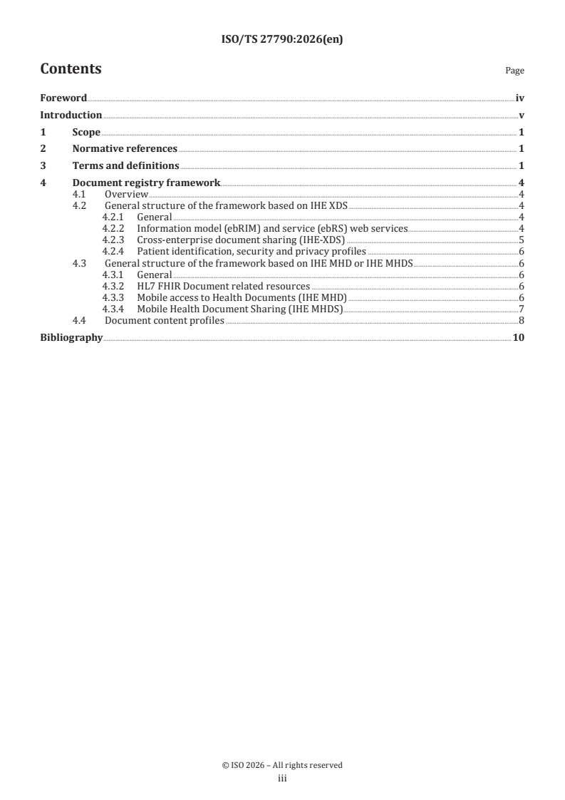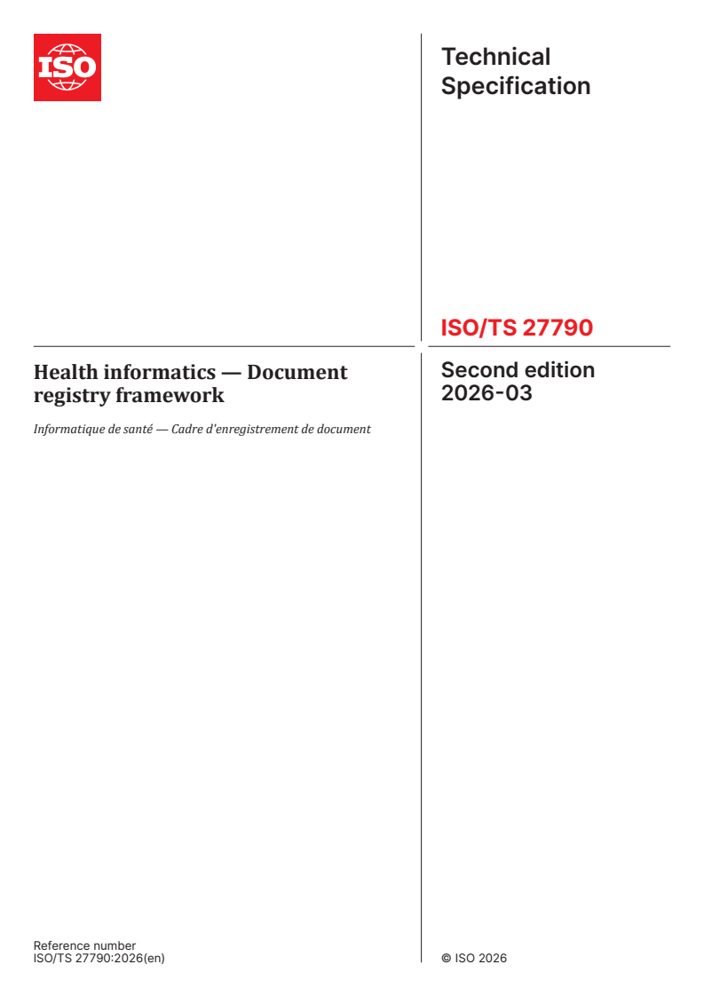 ISO/TS 27790:2026 is a technical specification published by the International Organization for Standardization (ISO). Its full title is "Health informatics — Document registry framework". This standard covers: This document specifies a general-purpose document registry framework for transmitting, storing and utilizing documents in clinical and personalized health environments. It is quite broad in its applicability to realise the goal of sharing health-related documents spanning a broad spectrum of health domains such as healthcare specialities covering laboratory, cardiology, eye care, etc. and the many areas of personalized health. This document also supports shared document registration and retrieval via the federation of documents’ registries (IHE Cross-Community Access) in terms of individual users to reduce health information extrusion possibilities. This document supports the sharing of documents of any standardized content in the context of healthcare and well-being. It describes the means of locating and accessing shared documents among a diverse set of health organizations. It is designed to leverage existing health informatics for structuring and semantically rich health information, if so desired. It does not require the development of new health informatics standards.