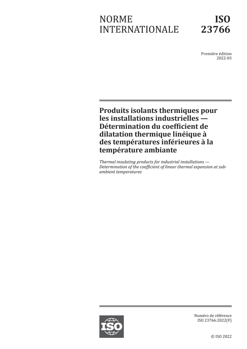 ISO 23766:2022 is a standard published by the International Organization for Standardization (ISO). Its full title is "Thermal insulating products for industrial installations — Determination of the coefficient of linear thermal expansion at sub-ambient temperatures". This standard covers: This document specifies the equipment and procedures for determining the coefficient of linear thermal expansion at sub-ambient temperatures (−196 °C to 25 °C), subject to the possible temperature limitation of the test specimens. It is not applicable to products which experience dimensional changes during the test due to the loss of hydration water or which undergo other phase changes.