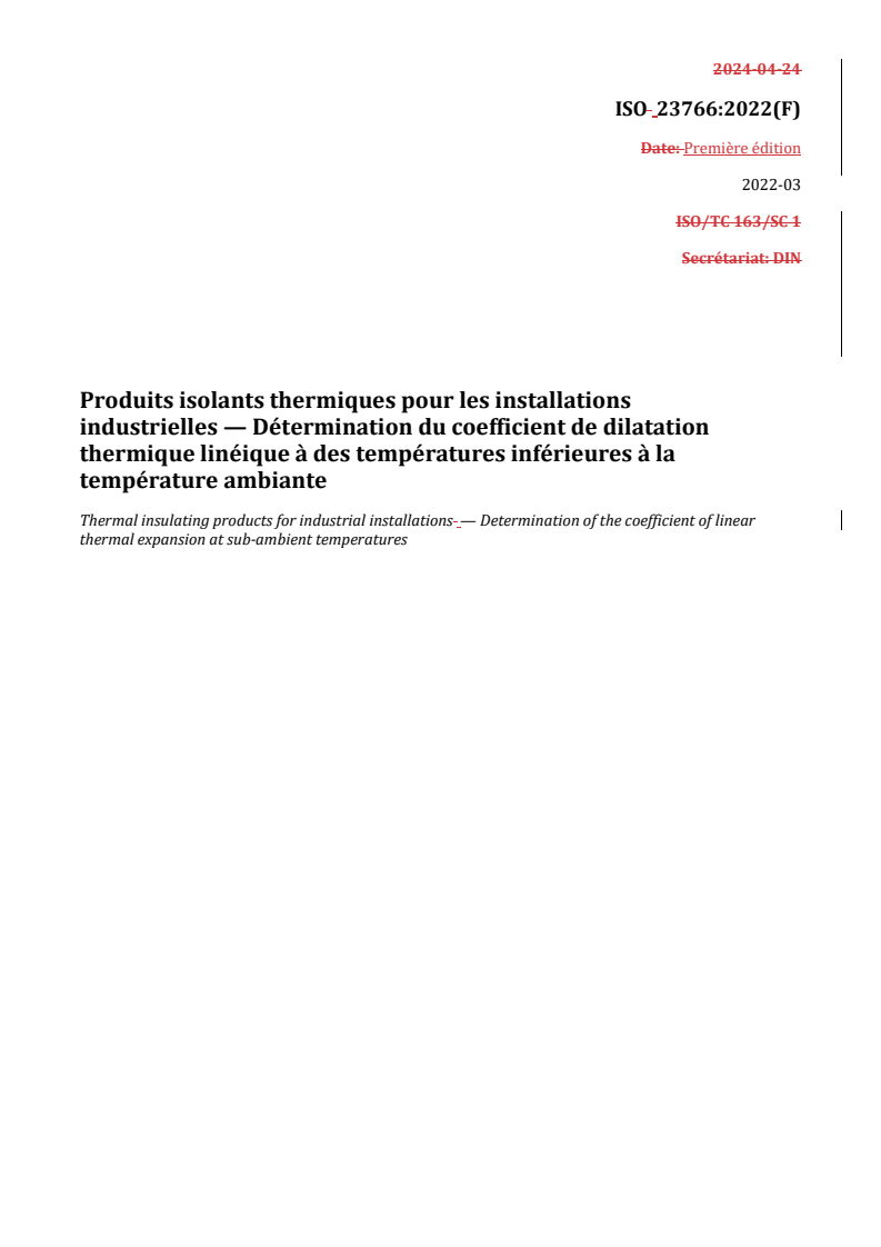 REDLINE ISO 23766:2022 - Produits isolants thermiques pour les installations industrielles — Détermination du coefficient de dilatation thermique linéique à des températures inférieures à la température ambiante Released:5/14/2024