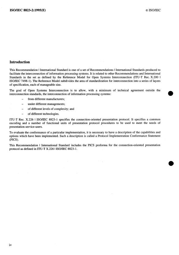ISO/IEC 8823-2:1995 is a standard published by the International Organization for Standardization (ISO). Its full title is "Information technology — Open Systems Interconnection — Connection-oriented presentation protocol: Protocol Implementation Conformance Statement (PICS) proforma". This standard covers: Information technology — Open Systems Interconnection — Connection-oriented presentation protocol: Protocol Implementation Conformance Statement (PICS) proforma