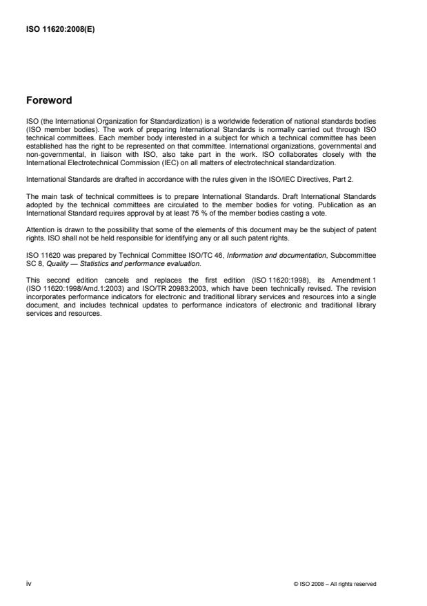 ISO 11620:2008 specifies the requirements of a performance indicator for libraries and establishes a set of performance indicators to be used by libraries of all types. It also provides guidance on how to implement performance indicators in libraries where such performance indicators are not already in use. The list and descriptions of the performance indicators are also summarized. ISO 11620:2008 provides a standardized terminology and concise definitions of the performance indicators. Furthermore, ISO 11620:2008 contains concise descriptions of the performance indicators and of the collection and the analysis of data needed. ISO 11620:2008 is applicable to all types of libraries in all countries. However, not all performance indicators are applicable to all libraries. Limitations on the applicability of individual performance indicators are also listed for each performance indicator. ISO 11620:2008 does not specify performance indicators for all services, activities, and uses of the resources of the library, either because such performance indicators had not been proposed and tested at the time of formulation of ISO 11620:2008, or because they did not fulfil the criteria specified.