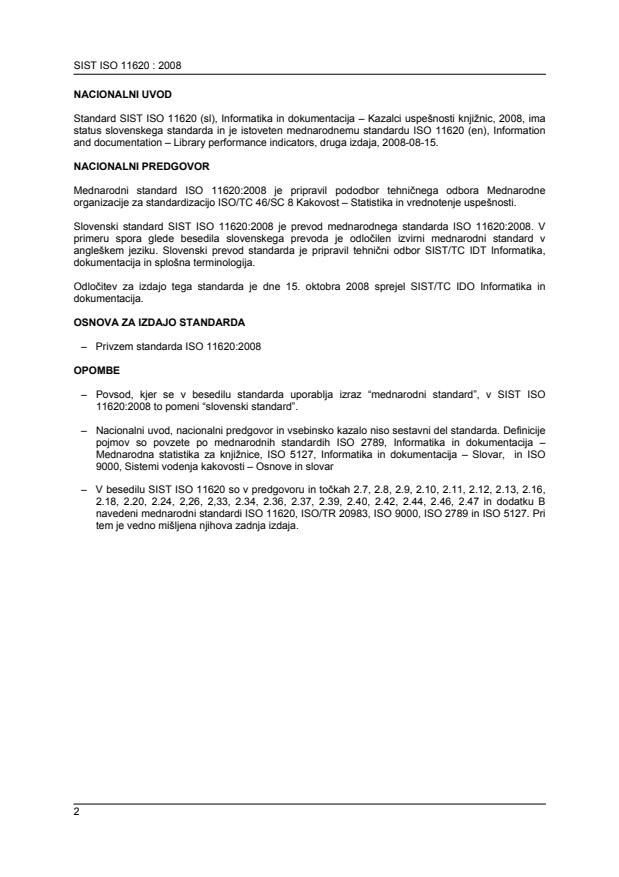 Ta mednarodni standard določa zahteve za kazalce uspešnosti knjižnic ter vzpostavlja nabor kazalcev uspešnosti, ki se uporabljajo v vseh vrstah knjižnic. Prav tako zagotavlja napotke, kako kazalce uspešnosti uvesti v knjižnicah, kjer ti kazalci še niso v uporabi. Seznam kazalcev uspešnosti je zbran v dodatku A, podrobnosti o uporabi kazalcev uspešnosti pa so podane v dodatku B. Ta mednarodni standard zagotavlja standardizirano izrazje in koncizne definicije kazalcev uspešnosti. Poleg tega ta mednarodni standard vsebuje jedrnat opis kazalcev uspešnosti ter opise zbiranja in analiziranja potrebnih podatkov. Ta mednarodni standard je uporaben za vse vrste knjižnic v vseh državah, vendar pa ni mogoče vseh kazalcev uspešnosti uporabiti v vseh knjižnicah. Omejitve uporabe posameznih kazalcev uspešnosti so za vsak kazalec uspešnosti posebej navedene v dodatku B. Ta mednarodni standard ne določa kazalcev uspešnosti za vse storitve, aktivnosti in uporabo virov knjižnice, bodisi zato, ker taki kazalci uspešnosti niso bili predlagani in preskušeni v času oblikovanja tega mednarodnega standarda, bodisi zato, ker ne izpolnjujejo določenih meril (glej točko 4.2).