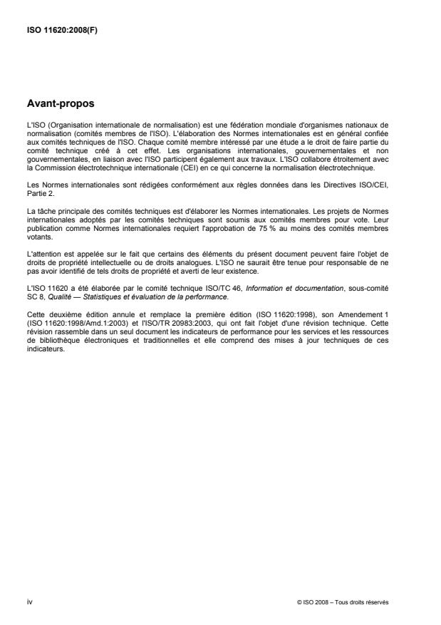 L'ISO 11620:2008 définit les spécifications d'un indicateur de performance des bibliothèques et établit une série d'indicateurs destinés à être employés par tous types de bibliothèques. Elle donne aussi des conseils sur la manière d'utiliser des indicateurs de performance là où ils ne sont pas encore en usage. La liste des indicateurs de performance est également résumée. L'ISO 11620:2008 offre une terminologie normalisée et une définition concise des indicateurs de performance. De plus, elle décrit précisément les modalités d'élaboration de ces indicateurs ainsi que les processus de collecte et d'analyse des données requises. L'ISO 11620:2008 s'applique à tous les types de bibliothèques dans tous les pays. Cependant tous les indicateurs de performance ne s'appliquent pas à toutes les bibliothèques. Les restrictions apportées à l'application d'indicateurs de performance particuliers sont énumérées pour chaque indicateur de performance. L'ISO 11620:2008 ne spécifie pas certains services, activités et utilisations des ressources de la bibliothèque ne font pas actuellement l'objet d'indicateurs de performance soit parce qu'aucun n'a été proposé et testé au moment de la rédaction de l'ISO 11620:2008, soit parce qu'aucun ne remplit les critères retenus.