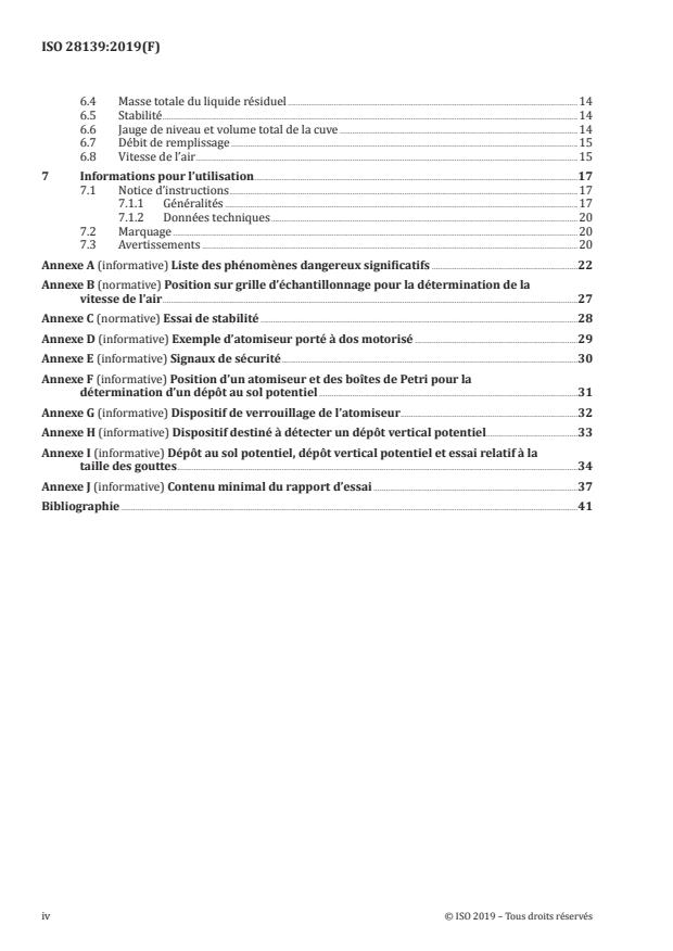 Le présent document spécifie les exigences de sécurité et leur vérification, les exigences environnementales et les méthodes d'essai associées, ainsi que les limites de performance minimales pour la conception et la fabrication des atomiseurs portés à dos motorisés tels que définis en 3.9. Il décrit les méthodes d'élimination ou de réduction des phénomènes dangereux dus à leur utilisation. En outre, il spécifie le type d'informations à fournir par le fabricant en ce qui concerne les pratiques d'utilisation sûre. Il traite des paramètres de fonctionnement général ainsi que du dépôt éventuel de gouttes pulvérisées dans des conditions maîtrisées et spécifiées. Le présent document traite de tous les phénomènes dangereux, situations dangereuses et événements dangereux significatifs, à l'exception des phénomènes dangereux résultant des vibrations transmises au dos de l'opérateur. Il est applicable aux atomiseurs portés à dos motorisés, lorsqu'ils sont utilisés normalement et dans les conditions prévisibles établies par le fabricant (voir Tableau A.1). Il n'est pas applicable aux: — atomiseurs à pression de liquide; — atomiseurs thermiques; — atomiseurs à froid; — atomiseurs adaptés pour une application de matière sèche. Il n'est pas applicable aux atomiseurs portés à dos motorisés qui ont été fabriqués avant sa date de publication. Les exigences du présent document s'appliquent aux produits fabriqués 18 mois après sa publication.