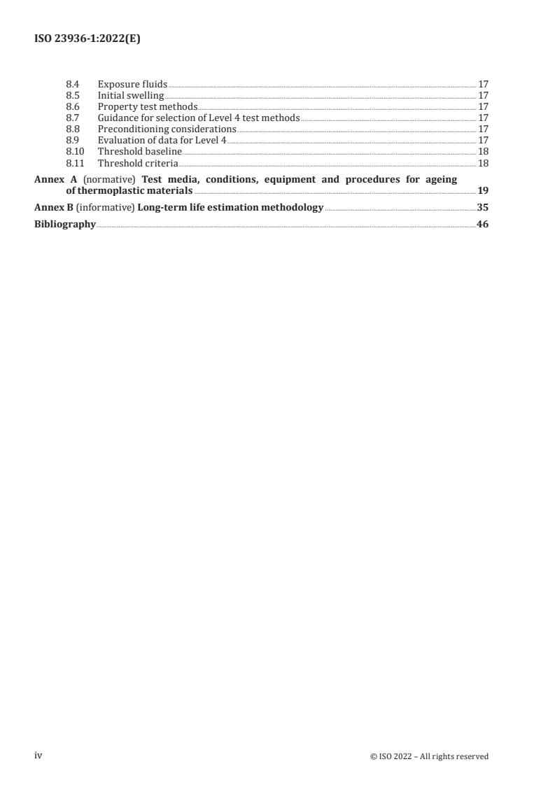 - Testing and reporting: Requirements for specimen identification, moulding, orientation, post‑treatment, test fluids, exposure temperatures/durations, property test methods and threshold criteria. Annex A details test media, conditions and procedures; Annex B covers long‑term life estimation methodology.