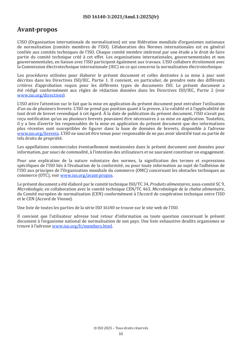 ISO 16140-3:2021/Amd 1:2025 - Microbiologie de la chaîne alimentaire — Validation des méthodes — Partie 3: Protocole pour la vérification dans un seul laboratoire de méthodes de référence et de méthodes alternatives validées — Amendement 1: Protocole pour la vérification des méthodes validées d’identification des micro-organismes Released:15. 08. 2025